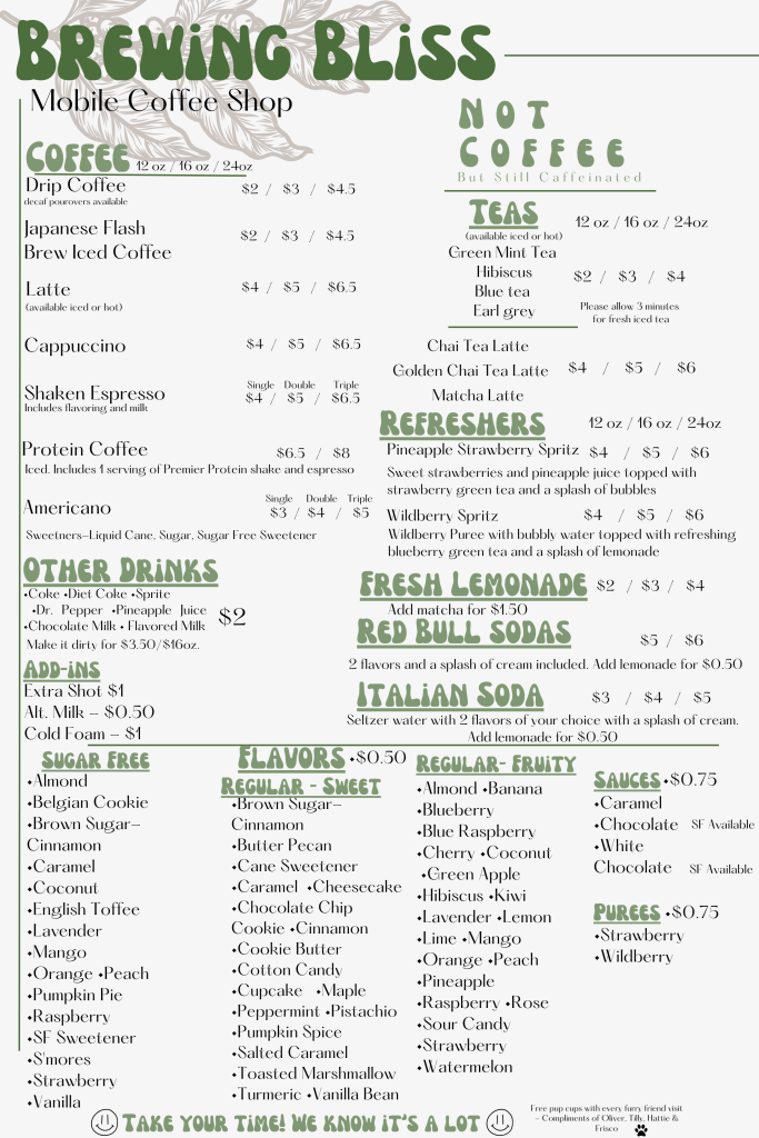 Follow Brewing Bliss on social media to stay updated on their latest locations and menu specials. And don’t forget to share your favorite drink with us—we’d love to see your Brewing Bliss moments!