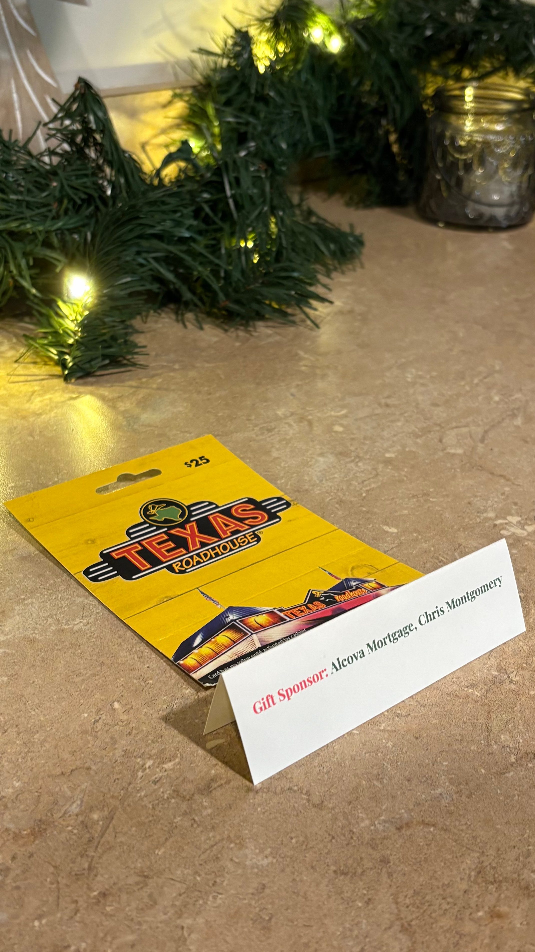 - Texas Roadhouse Gift Card donated by Chris Montgomery of Alcova Mortgage